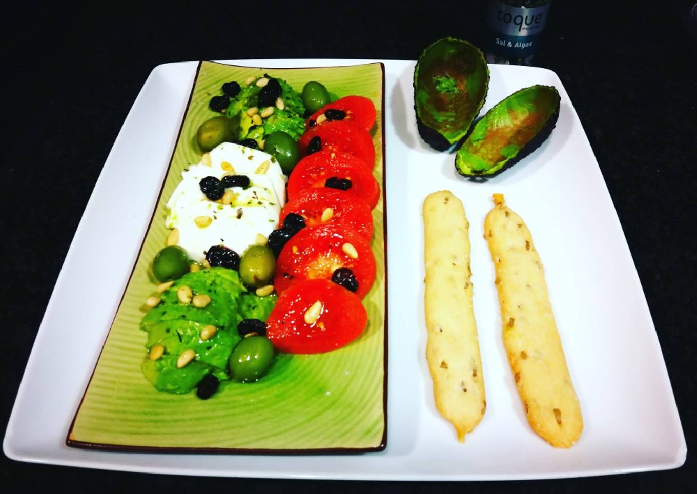 - Coloca los ingredientes en un plato. Añade las olivas verdes, los cranberries y los piñones. Rocía los ingredientes con zumo de limón y aceite de oliva virgen extra de buena calidad. Muele sal gruesa con algas por encima y acompaña con las barritas de pan con semillas de girasol.