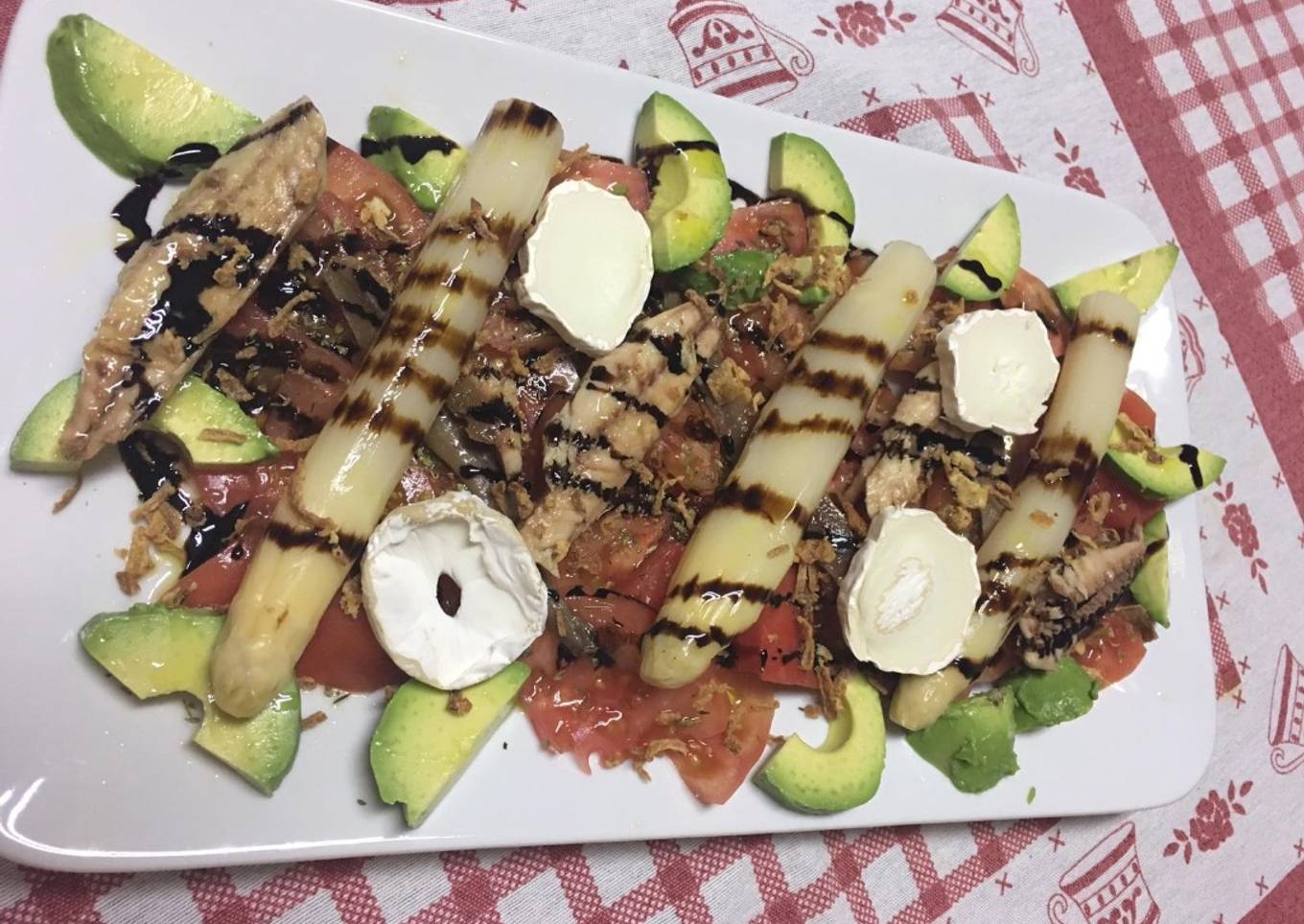Ensalada de tomate, aguacate, espárragos de Navarra, melva y rul