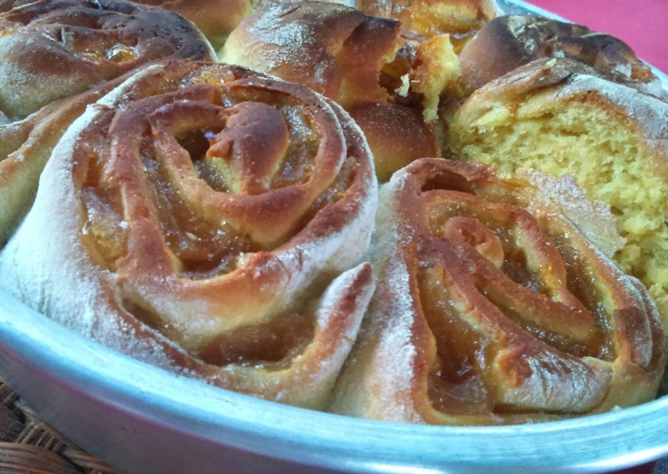 - Precalentamos horno a 180°. Acomodamos en el molde y dejamos leudar un rato más en lugar cálido (en mi caso arriba del horno), unos 20 a 30 minutos más hasta que crezca y ocupe mejor el molde. Luego, horneamos por 20-25 minutos o hasta dorar, luego dejamos enfriar antes de desmoldar o comerla (a menos que no le temas al dulce caliente...). Una bomba, definitivamente voy a hacerla más seguido :9
