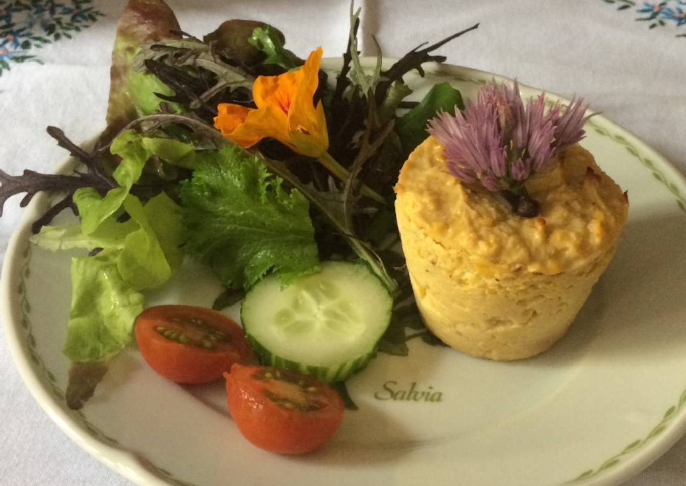 - Distribuir la mezcla en 6 moldes de flan, a los que se habrá rociado con spray vegetal. Disponer sobre bandeja de horno con un poco de agua, para efecto baño-maría. Cocinar unos 15' o hasta que se dore ligeramente la superficie. Ya está! Son buenos calientes, tibios o fríos.