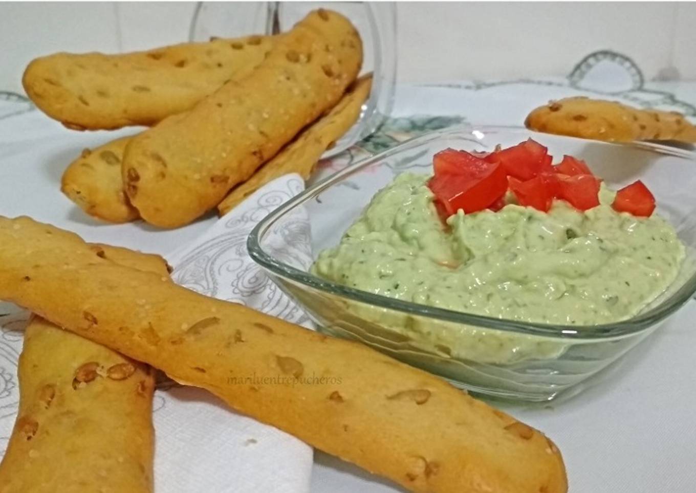 Dip de aguacate con yogur y snacks de pipas