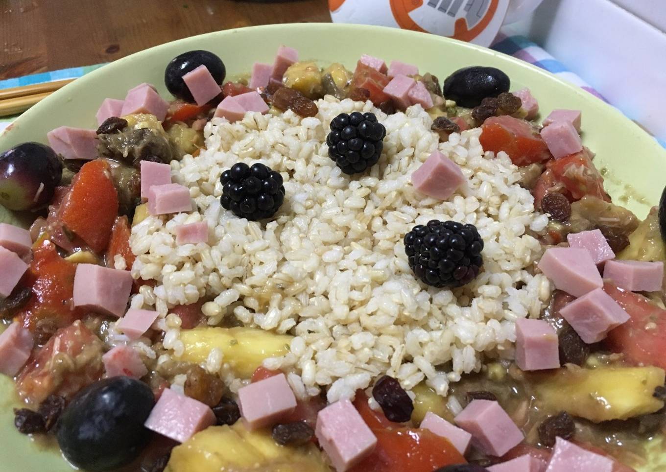 - A continuación, echamos el arroz integral ya cocido en el centro junto con el resto de alimentos alrededor. Yo he puesto las moras encima del arroz porque al romper con el tenedor mancha al arroz y el sabor es genial.