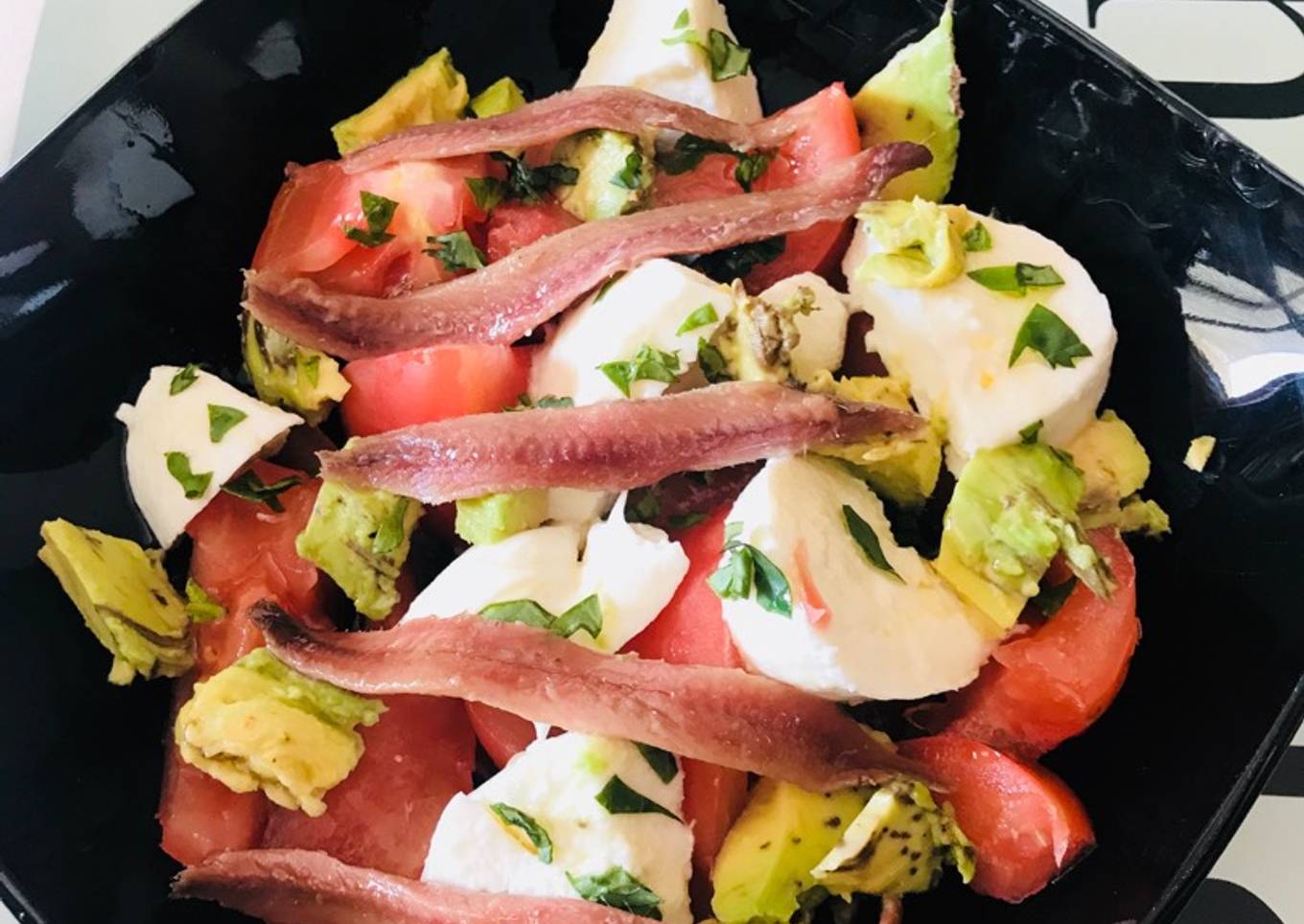 Ensalada de tomate, mozzarella, aguacate y anchoas, con albahaca fresca y regada con Aceite oliva