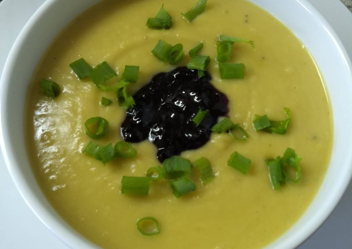 Sopa crema de batatas con mermelada de arándanos