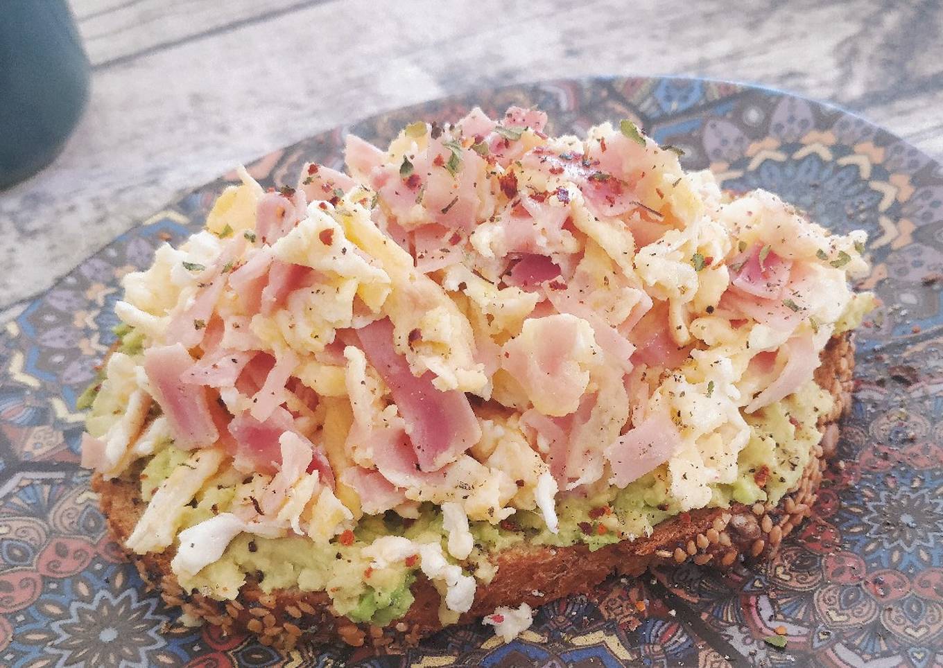 Tosta de aguacate y huevos revueltos con jamón cocido