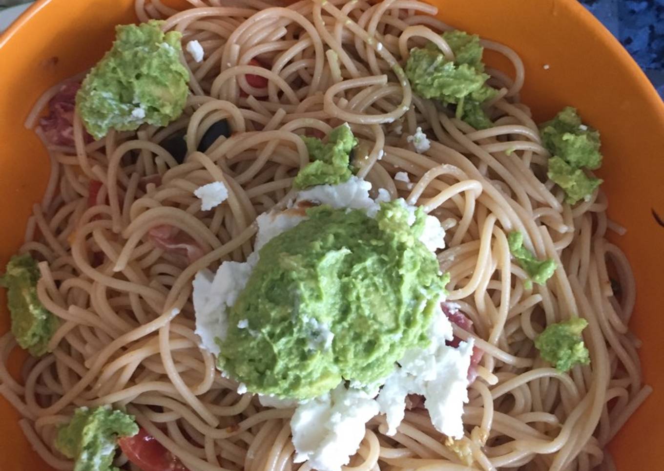 Espaguetis integrales, aguacate triturado, queso cottage, verduras asadas, tomates cherry