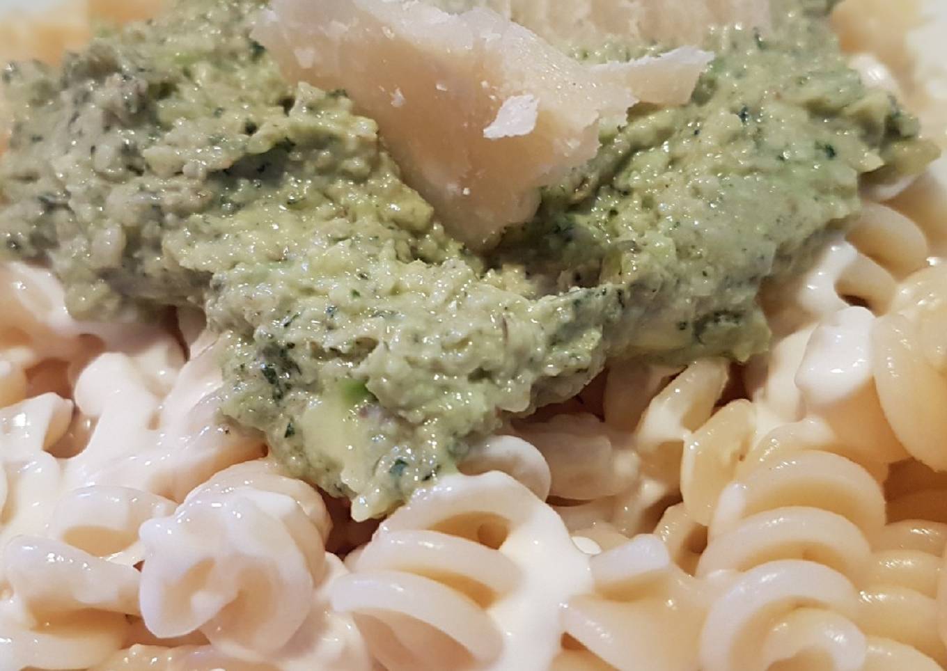 - En un plato servimos la pasta cocida mezclada con la mayonesa y añadimos el pesto por encima y unas lonchas de parmesano para decorar (opcional). Listo, a disfrutar.