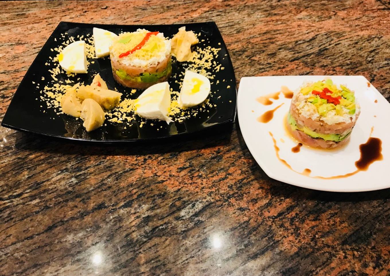 - Por último, retiramos el aro y añadimos el huevo rallado y pimiento, para decorar y servimos. También podéis poner semillas de sésamo en vez de pimiento o huevo.