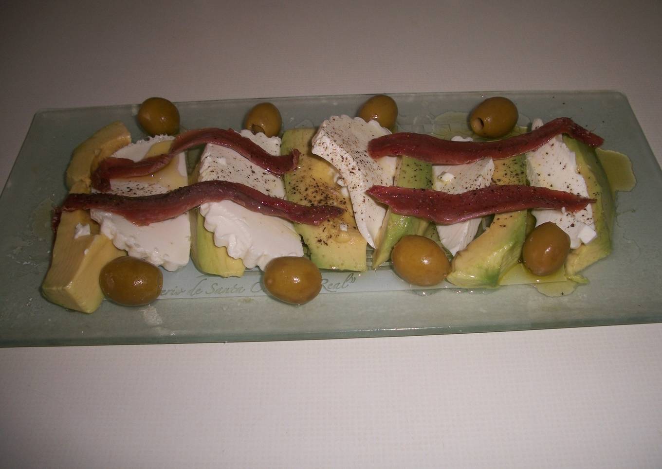 Rodajas de aguacate con queso fresco por encima y una anchoa, se riega con el aceite de las anchoas enlatadas y se sirve bien frío.