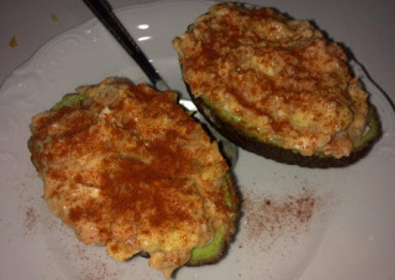 - Rellenamos los aguacates, y espolvoreamos con pimentón picante por encima (o dulce, según el gusto de cada uno).