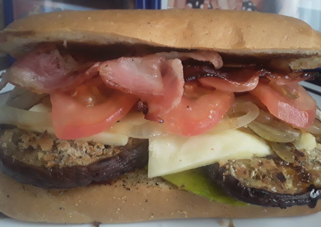 Bocadillo hecho con berenjenas apanadas dulces tocineta tomate queso aguacate y cebollas salteadas!!! Las berenjenas estรกn salseadas con panela y bbq... las berenjenas absorben mucho sabor de lo que le pongas y por eso me gustan mucho...