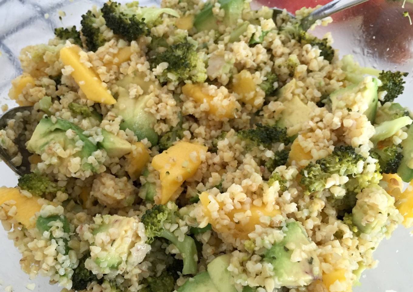 - Bulgur frío en un bol. Desmenuzamos las ramitas de brócoli y partimos el mango a trocitos.