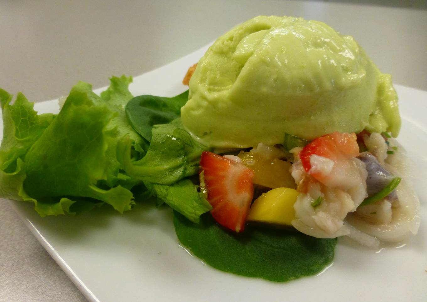 - En un plato pequeño, añadimos unas hojas de lechuga, unas cucharadas de ceviche de rape, un poco de la fruta y por ultimo, al lado ponemos una bola de helado de aguacate.
