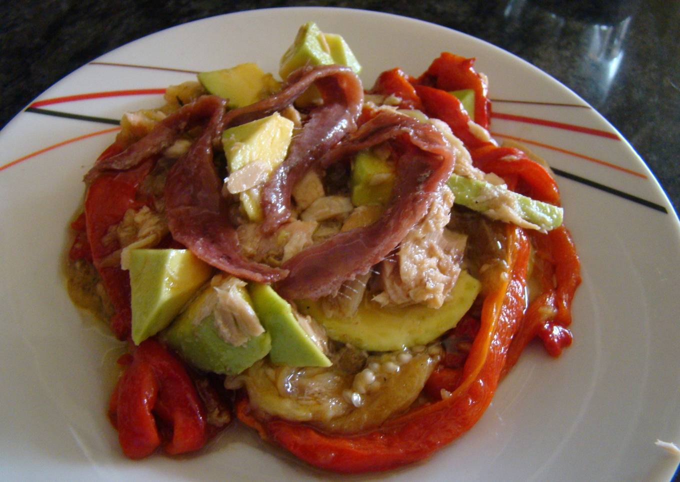 - Cuando tenemos la verduras bien colocadas en la fuente de servir le ponemos el atún, las anchoas y lo dejamos enfriar hasta la hora de servir.