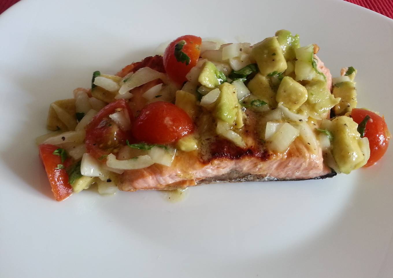 Salmón con vinagreta de totates cherry y aguacate