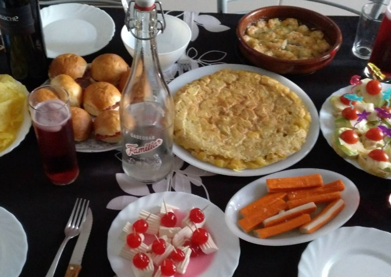 Unas tapas sencillas pero muy ricas y apetecibles, una tortilla de patatas con pimiento, unas gambas al pilpil, unas medias noches rellenas, palitos de surimi y tostas de bacalao y aguacate.