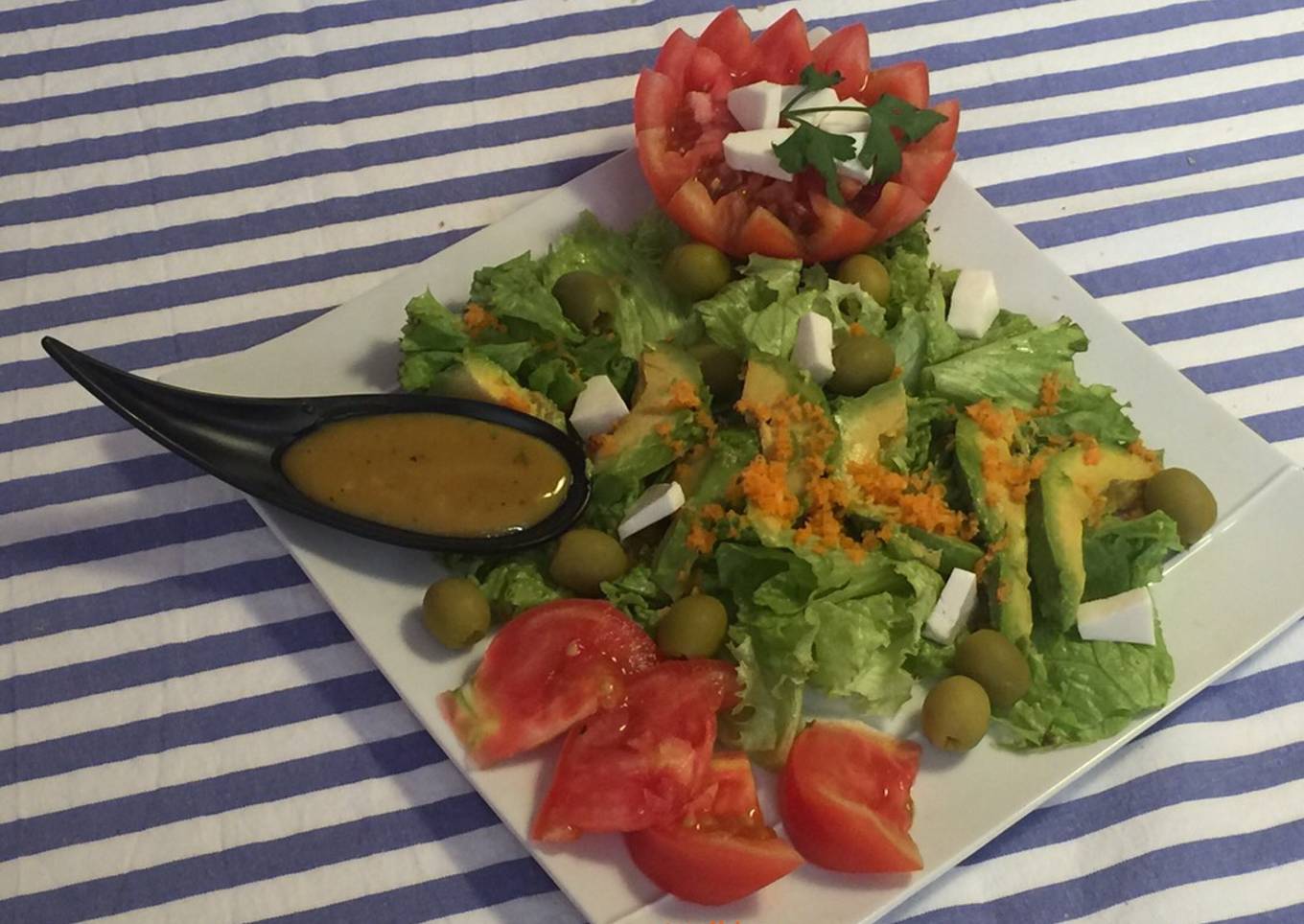 - Lavamos muy bien la lechuga, el tomate y hacemos la ensalada junto con el resto de ingredientes. Cada persona con su porción de ensalada en el plato le pone el aliño al gusto. Queda con un sabor exquisito...