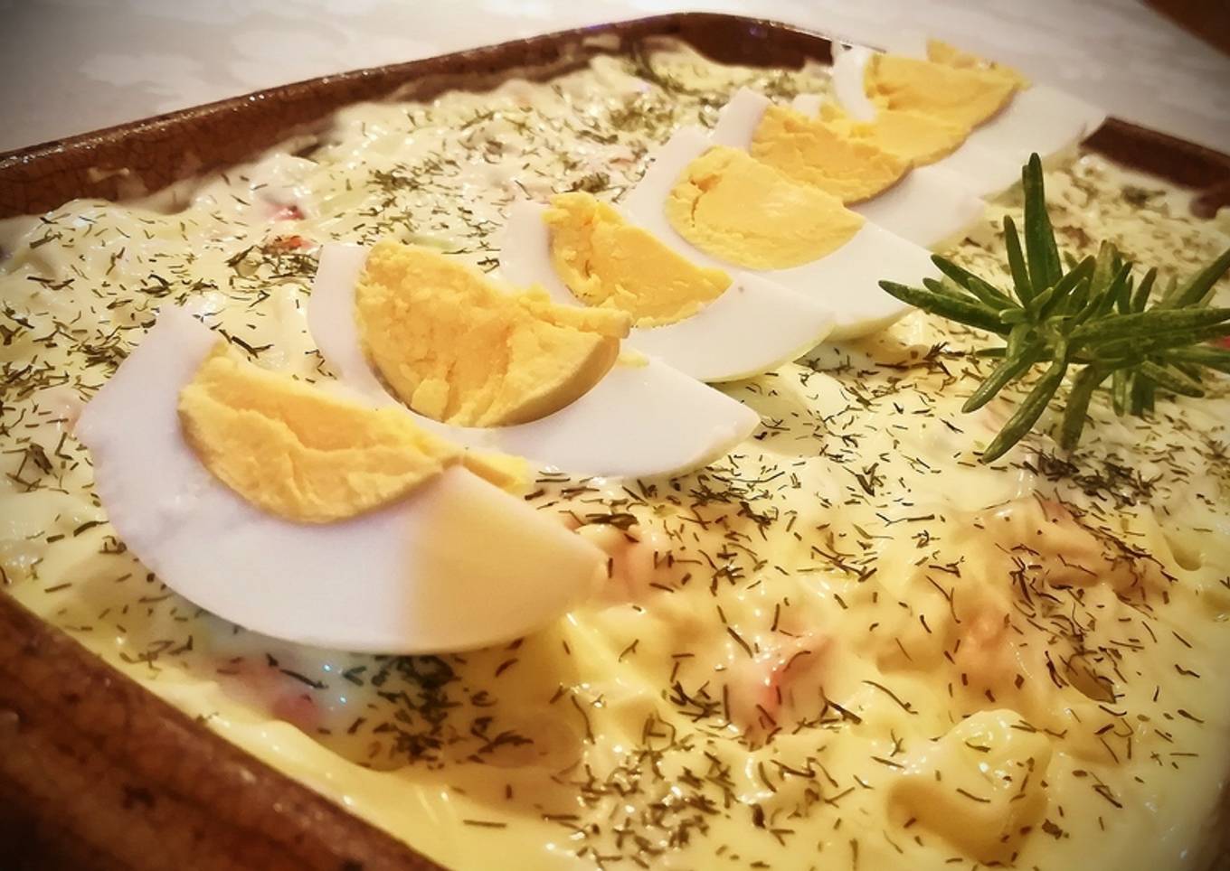 - Pasado el tiempo la sacamos del frío y la decoramos como mejor nos parezca, yo espolvoreé Eneldo por encima y como tenía tiempo cocí dos huevos que corté en octavos una vez fríos y pelados y los dispuse por encima de la ensaladilla