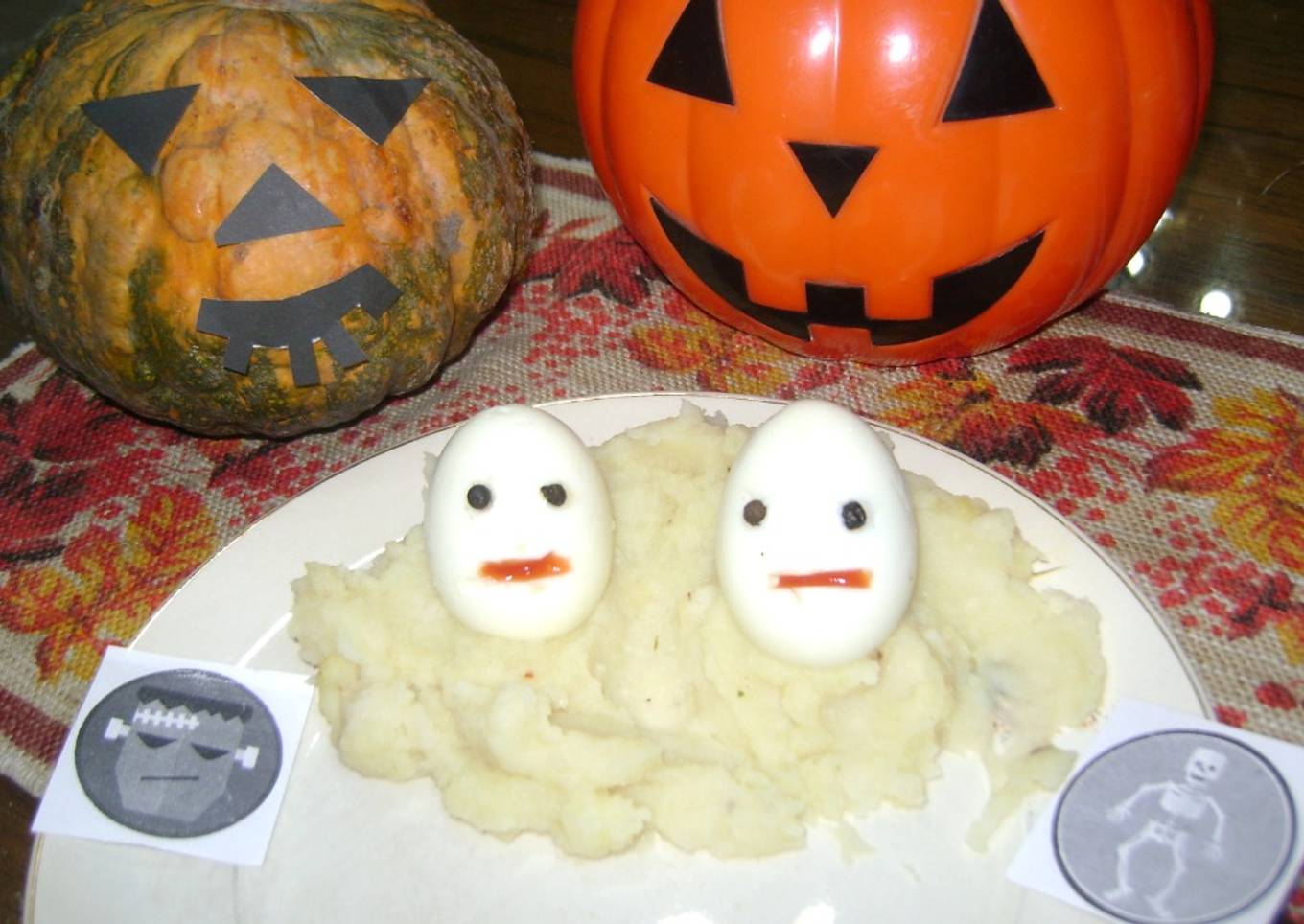 #recetasterrorificas - sobre puré de papas, batata, zapallo, hojas verdes - una forma divertida de presentar huevos duros