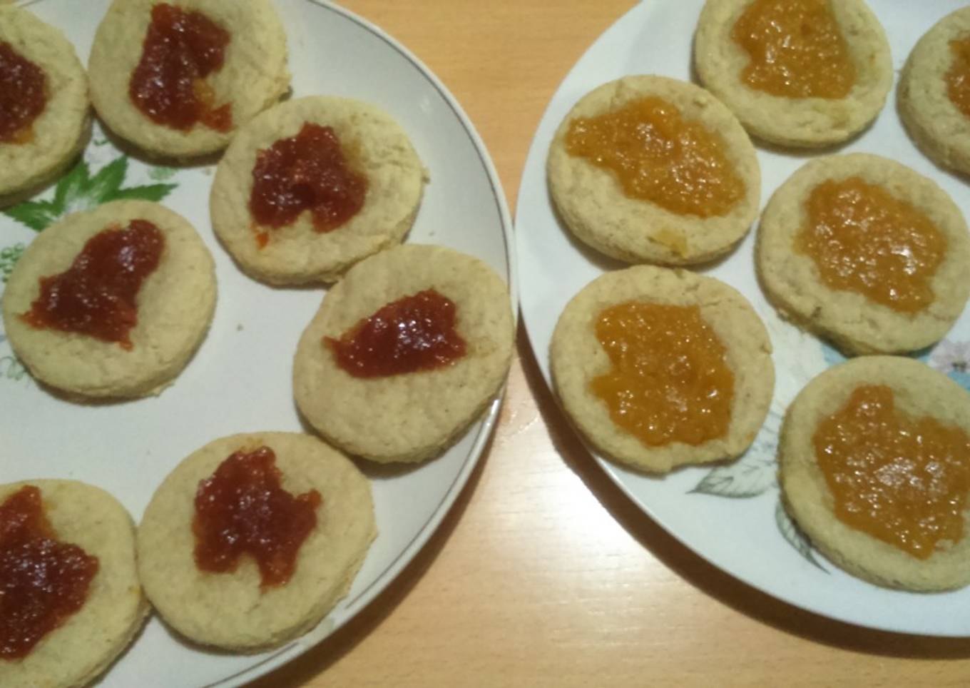 - Añadimos líquido de a poco, integrando hasta tener una masa quebrada que apenas se mantenga unida. Si hiciera calor, llevamos la masa unos 10-20 minutos a la heladera. Estiramos con palote y cortamos galletitas en tamaño deseado. Llevamos a placa apenas enharinada, presionamos un poquito el centro del las cookies y les ponemos un poquito de dulce o mermelada a cada uno.